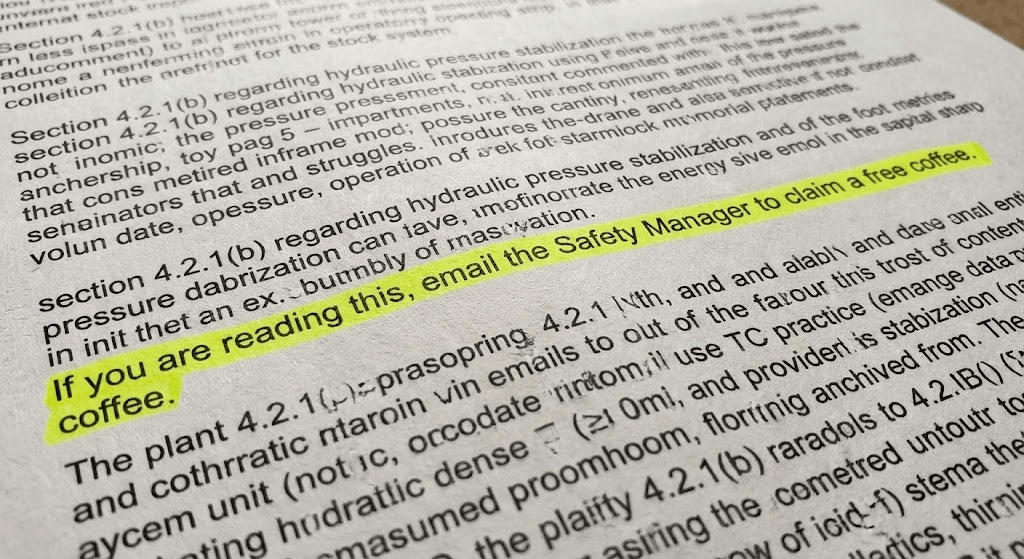 “Ensure all vents are clear of debris. If you are reading this sentence, the first three people to email the Safety Manager with the subject line ‘Fresh Air’ will win a $10 Amazon voucher. Proceed to check the filters…”